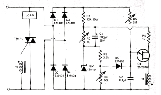 Encontramos este circuito simple en una publicación inglesa denominada Electronic Circuit Design en el 3 de la primavera de 1980. El circuito puede mantener constante la tensión en cargas como lámparas incandescentes y elementos de calentamiento con potencia máxima que depende del Triac, independientemente de las variaciones de la tensión de la red. Los diodos son todos 1N4004 o 1N4007 y T1 se enrolla en un bastón de ferrita que consiste en aproximadamente 100 + 100 espiras de hilo 28 o 30 AWG. Vea que el sentido de las bobinas debe ser observado. El triac puede ser cualquiera de la serie TIC según la carga alimentada. El circuito funciona tanto en la red de 110 V como 220 V. El potenciómetro de 5 M puede ser sustituido por el valor comercial actual que es 4M7. Recomendamos la conexión en serie con este potenciómetro de un resistor de 100k, no previsto en el circuito original.