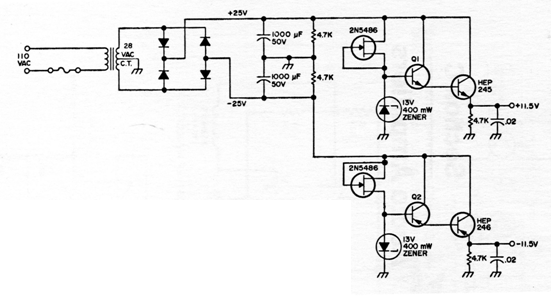 A pesar de ser de una documentación antigua, este circuito es viable actualmente bastando usar transistores equivalentes modernos, como el par TIP31 y 32 para la salida y los BC548 y BC558 como conductores y para los FET los BF245. El transformador es de 1 A.