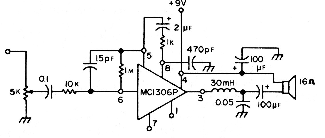 Este amplificador utiliza un circuito integrado de 1975, poco común actualmente. El circuito tiene una ganancia de 30 dB y utiliza una salida sin transformador con alimentación de 9 V.