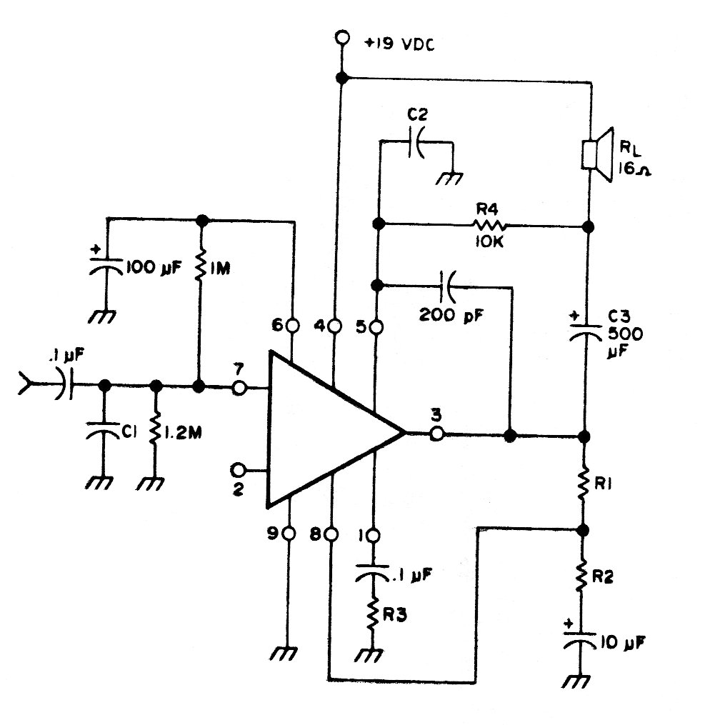 Este amplificador integrado se utilizaba en televisores de la década de los 70, presentando buenas características de sensibilidad. El circuito se alimentaba con 9 V.