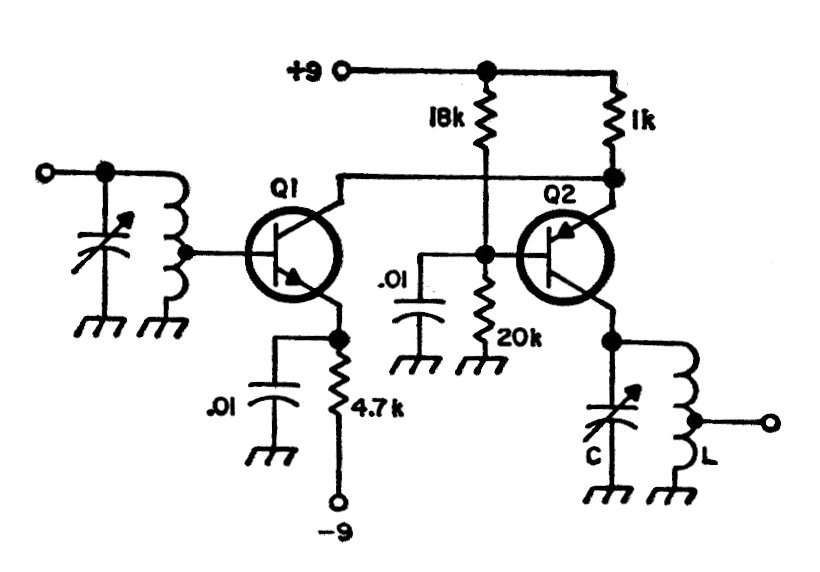 Los transistores son 2N918, 2N3464 y otros equivalentes de RF de la época a Q1. Para Q2 se pueden utilizar los 2N3399, 2N2894 y otros. Las bobinas son conforme a la frecuencia. El circuito opera en frecuencias hasta aproximadamente 100 MHz o más si se utilizan transistores apropiados. El circuito es de documentación de los años 70.