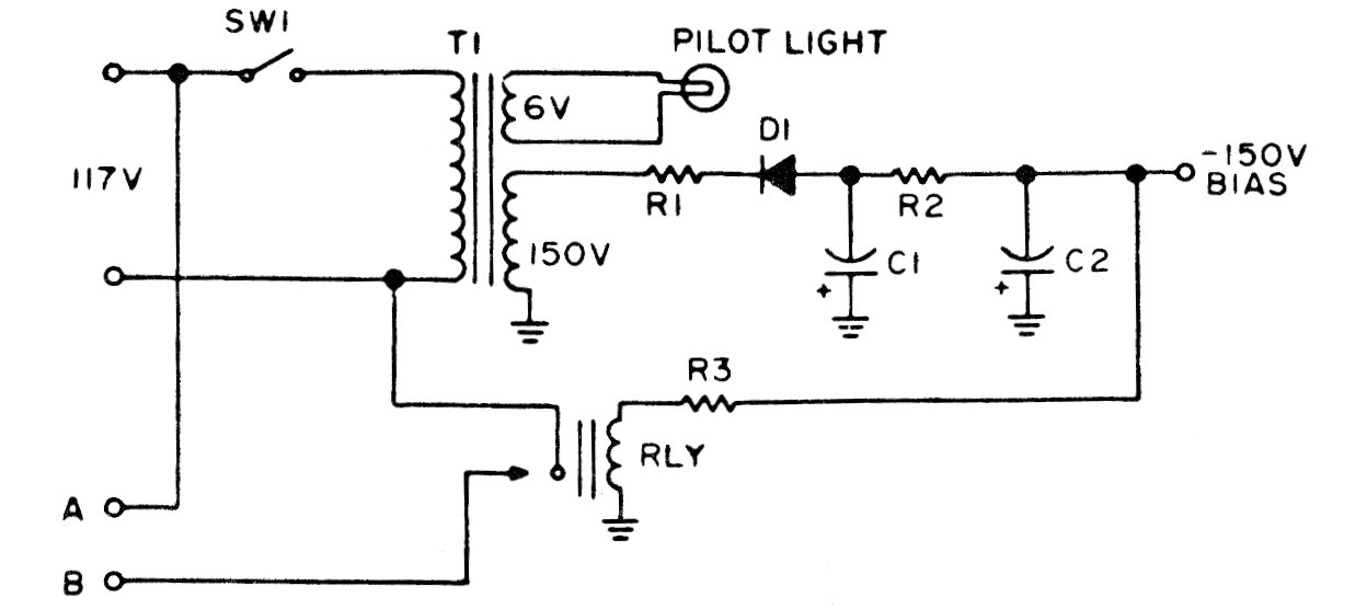La finalidad de este circuito es cortar la alta tensión cuando la tensión de polarización falla. El circuito es de una documentación de 1975 pudiendo ser adaptado para otras finalidades.