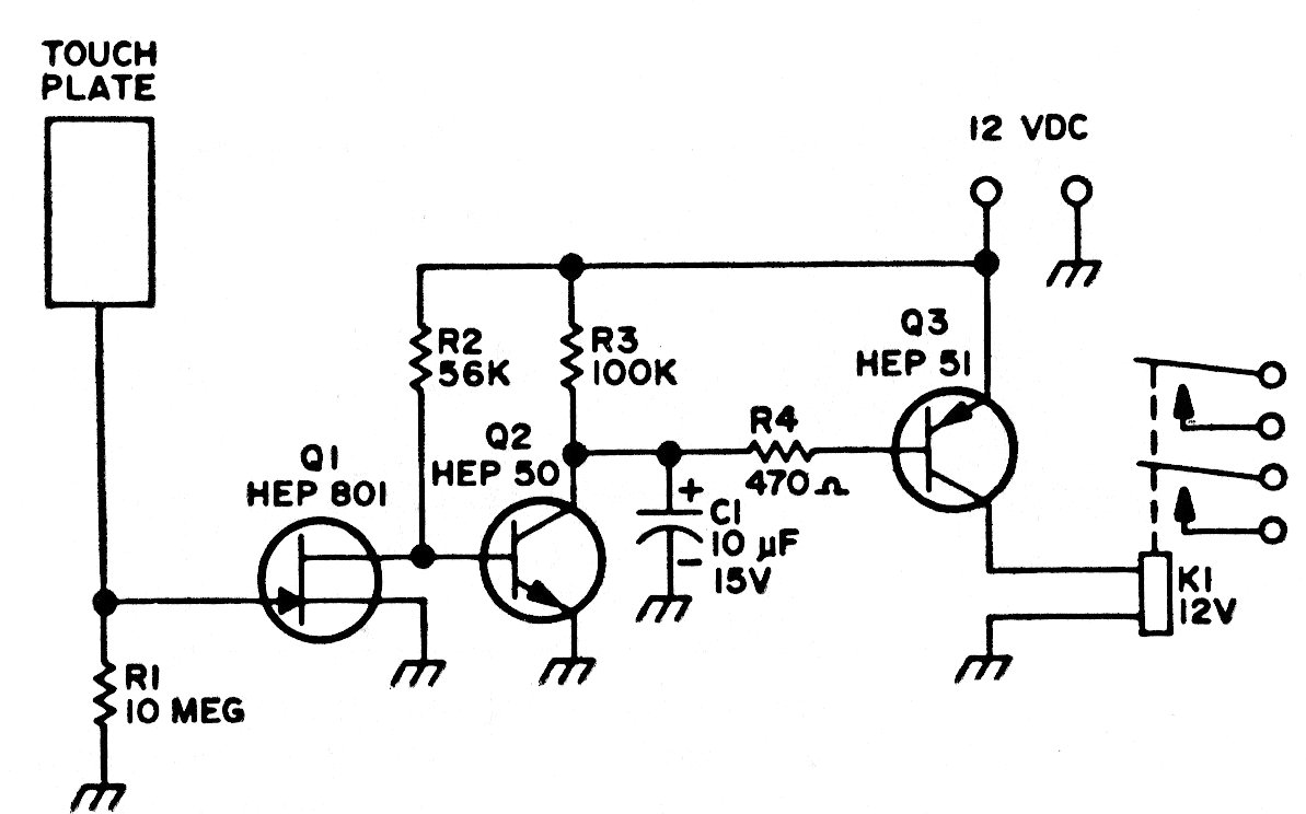 Este circuito es de una publicación antigua, pero puede ser montado con componentes modernos. Podemos usar el BF245 para el FET y el par BC548 y BC558 para los bipolares. El relé es de 12 V del tipo sensible. Nunca utilice fuente sin transformador para alimentar este circuito.