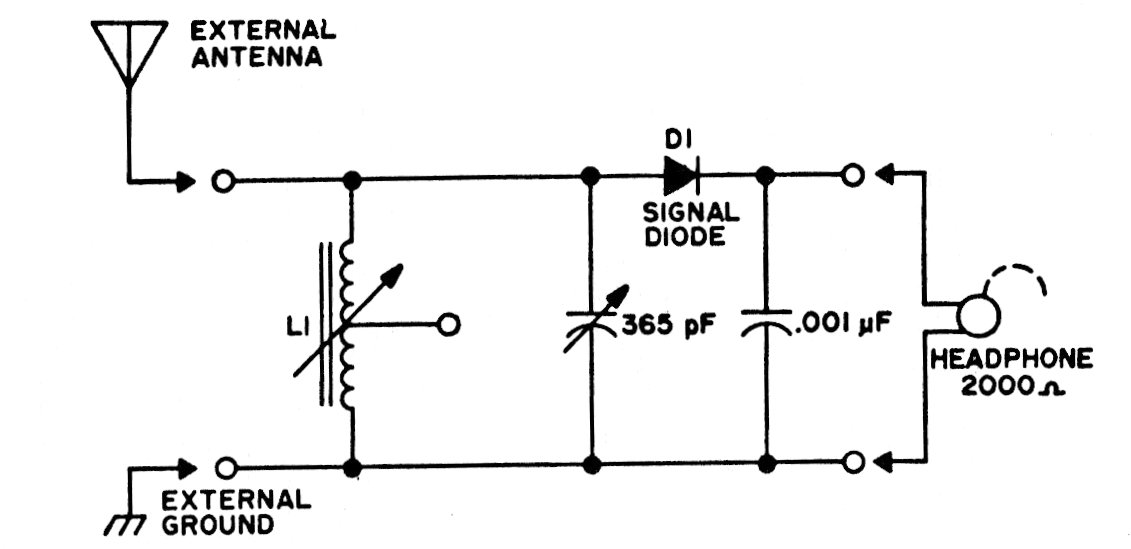 Esta radio de cristal o galena es una de las muchas versiones disponibles en este sitio. Esta es una documentación de los años 70. La bobina está formada por 50 + 50 espiras de hilo 28 en un bastón de ferrita. El auricular debe ser de cristal o piezoeléctrico.