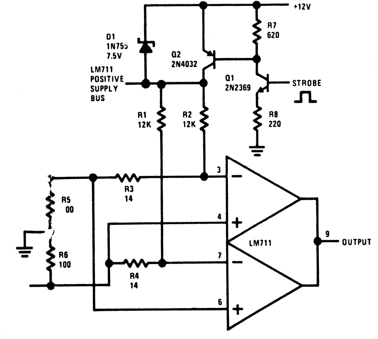 La finalidad del circuito de strobe en este amplificador para sensor es reducir el consumo. El circuito es de una documentación antigua (años 70), pero la idea puede ser aprovechada en aplicaciones modernas.