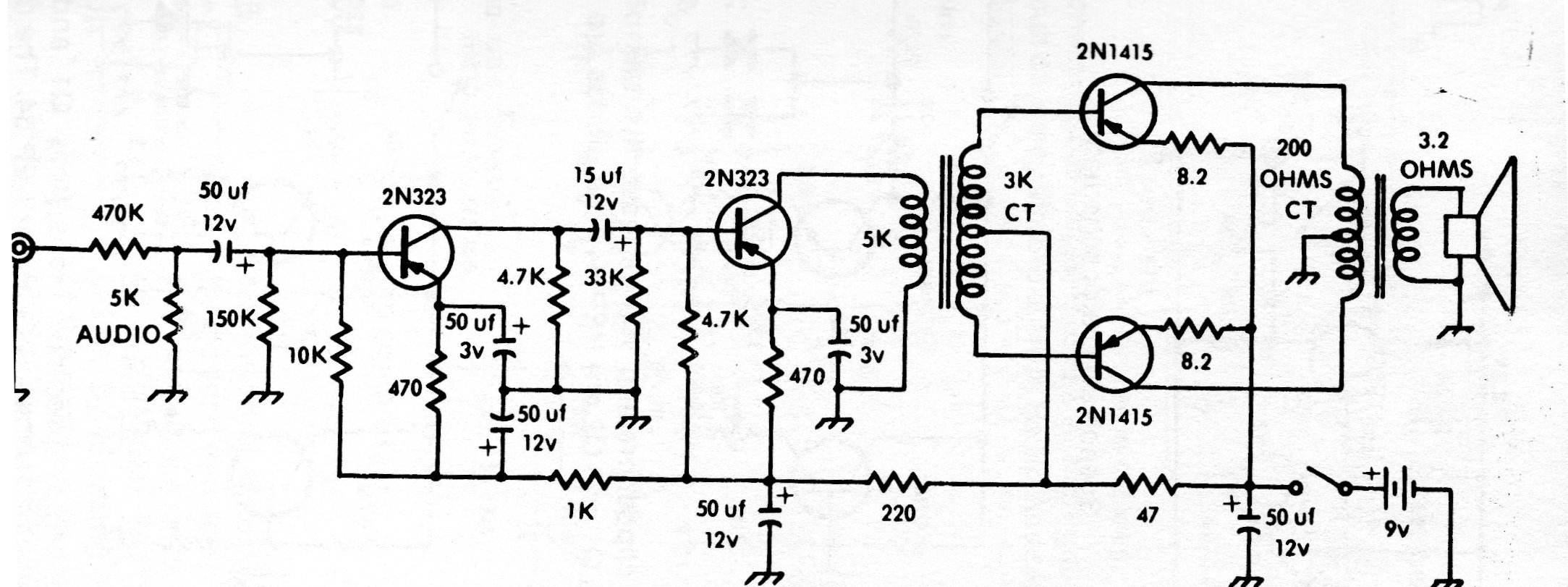 Este circuito de algunos watts de potencia muestra una configuración típica de los años 70 usando transformadores de controlador y salida. Los transistores de salida deben utilizar el disipador.
