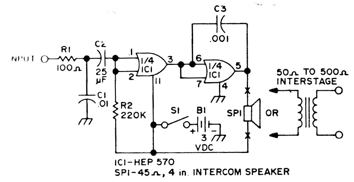 Esta configuración encontrada en una documentación de Motorola consiste en un circuito experimental que utiliza funciones lógicas como amplificadores. El circuito puede necesitar modificaciones para funcionar con componentes equivalentes modernos.