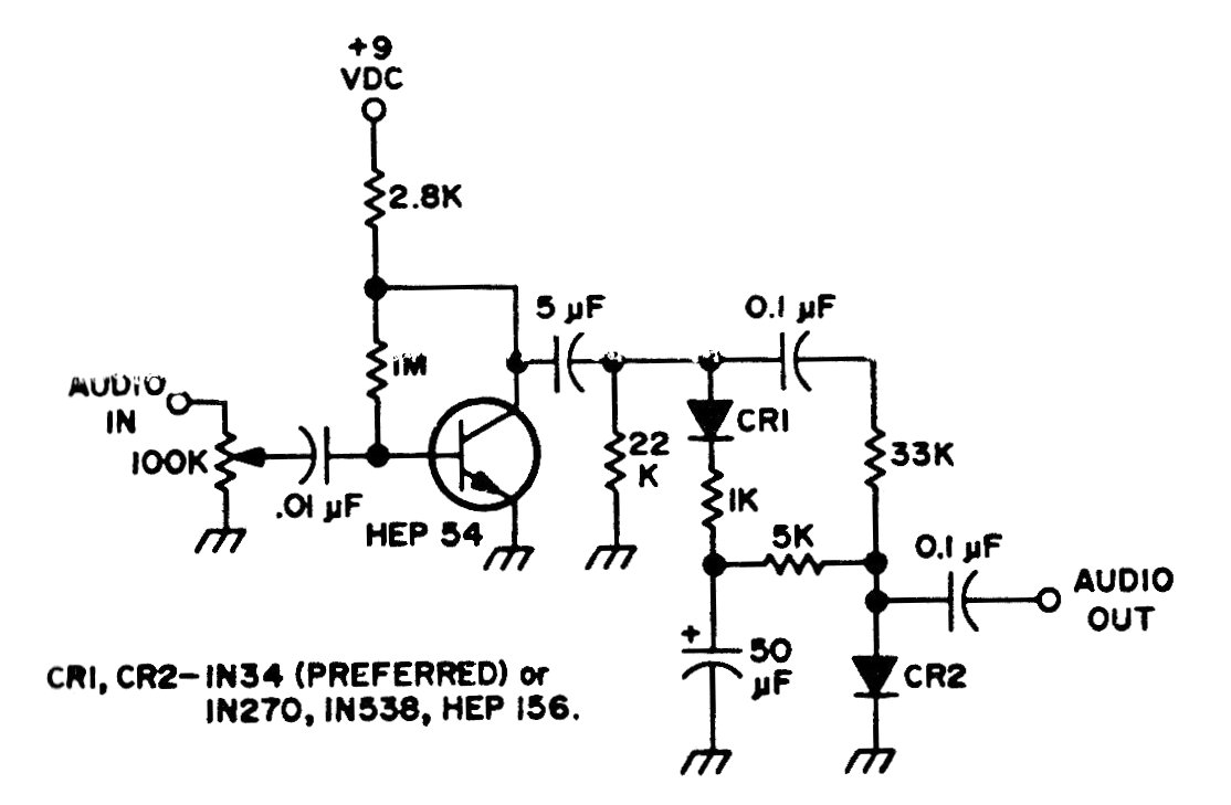 Este circuito, de un manual Motorola, utiliza transistores de la época pero puede ser implementado con un BC548. Los diodos son de uso general y la alimentación debe venir de fuente o batería, ya que el consumo es bajo.