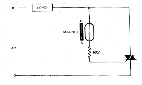 Encontramos este circuito simple en una publicación inglesa denominada Electronic Circuit Design en el n3 de la primavera de 1980. El circuito muestra cómo un reed-switch de baja capacidad de corriente puede ser usado para conectar un triac y con ello controlar una carga de alta potencia. En este circuito la corriente en el reed switch es de algunos cientos de miliampères como máximo. El Triac puede tener corrientes de varios amperios, como los de la serie TIC (TC226, TIC236, etc.).