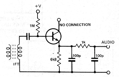 Encontramos este circuito simple en una publicación inglesa denominada Electronic Circuit Design en el no 3 de la primavera de 1980. El circuito consiste en una configuración que muestra cómo usar un transistor común como detector. Se utiliza la unión base-emisor y los mejores resultados en términos de sensibilidad se obtienen con transistores de germanio, en cuyo caso obtenemos un diodo equivalente a los 1N34 o 1N60. El capacitor sin valor tiene valores típicos entre 22 nF y 220 nF. Observe que el terminal de colector permanece sin conexión. La tensión + V puede quedar entre 3 y 15 V.