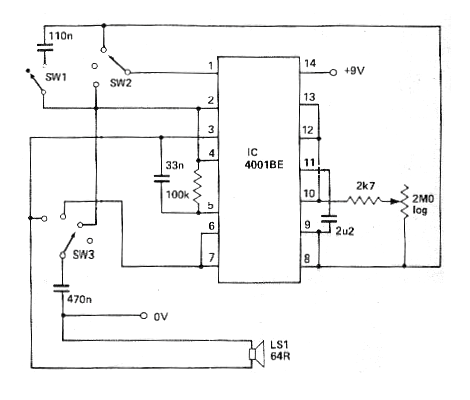 La revista Electronics Today International en la versión impresa ya no existe. Este diagrama salió en el número de diciembre de 1980 y consiste en un generador de sonidos diferentes, que pueden ser ajustados en un potenciómetro de 2,2 M (o 2 M) y seleccionados en una llave de 3 posiciones, además de un interruptor simple. El circuito es alimentado por una tensión de 9 V. En ausencia del altavoz de 64 ohms, utilice una cápsula piezoeléctrica de alta impedancia o un altavoz de 8 ohms en serie con un resistor de 47 ohms. Otra opción consiste en conectar la salida a un paso amplificador, pero en este caso la alimentación debe ser hecha por fuente. El circuito también funcionará con alimentación de 6 V.