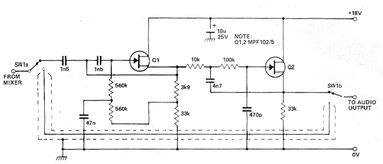 La revista Electronics Today International en la versión impresa ya no existe. Este diagrama salió en el número de diciembre de 1980 y consiste en un filtro activo de audio, para ser intercalado entre un mezclador y otra fuente de señal y la entrada de un amplificador. La alimentación se puede extraer del propio amplificador, ya que la corriente es muy baja. Los transistores pueden ser sustituidos por equivalentes como el BF245. El circuito filtra ruidos, eliminándolos.