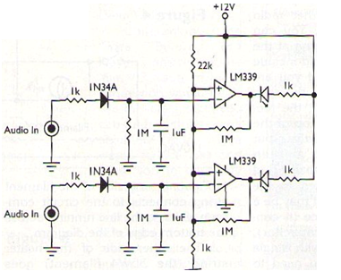 Este circuito es de una revista americana de 2003 consistente en un simple indicador de nivel de señal de audio. El indicador es estéreo y se conecta a la salida del amplificador. Los LED se encienden en presencia de la señal. El circuito es alimentado por 12 V de fuente externa. Vea en la sección de datasheets el pinado del LM339 o en otros artículos del sitio donde se utiliza este componente.