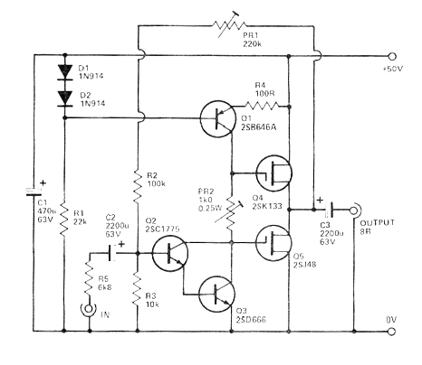 Este circuito salió en una Electronics Today International de abril de 1981. Los componentes críticos son los MOSFET de potencia. Si se pueden obtener los demás componentes son comunes. Observe la necesidad de una fuente de alimentación de 50 V con al menos 1 A. Los transistores de potencia deben montarse en buenos radiadores de calor. Los transistores de la serie 2SC pueden eventualmente ser reemplazados, pero deben realizarse pruebas. Para Q1 podemos experimentar el BD136, para Q3 el BD135 y para Q2 el BC547.