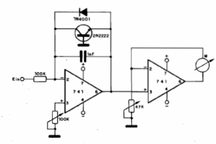 La indicación de corriente en el miliamperímetro conectado a la salida de este circuito corresponde a una tensión de entrada en una escala logarítmica. El ajuste del circuito para operación correcta se realiza en los dos trimpots. La fuente de alimentación debe ser simétrica de 5 a 12 V. El transistor 2N2222 es el responsable del comportamiento logarítmico del circuito junto con el diodo. Se pueden utilizar amplificadores operacionales equivalentes. La tensión de entrada no debe superar la tensión de alimentación. El circuito puede ser modificado para operación con sensores, haciéndolos operar en una escala logarítmica.
