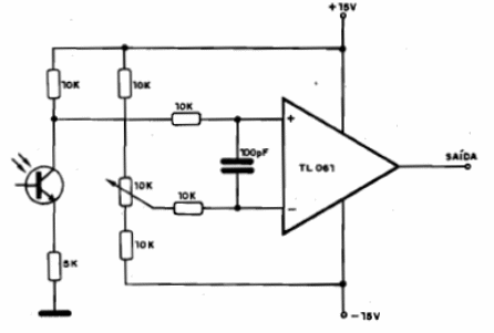 Este es un amplificador de alta-ganancia para foto-transistores que puede ser usado en la entrada de enlaces ópticos que no tienen velocidad muy alta. La alimentación debe ser hecha con una fuente simétrica de 6 a 15 V y otros amplificadores operacionales con FET en la entrada de la serie TL pueden ser utilizados. La ganancia se ajusta en el potenciómetro y la salida es de baja impedancia.
