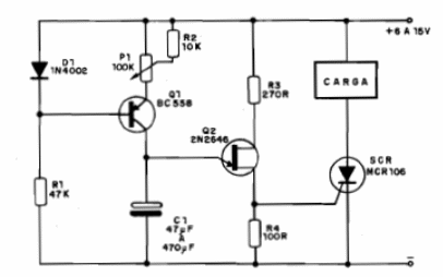En este circuito temporizador el capacitor de tiempo C1 se carga a través de una fuente de corriente constante. Esto permite calibrar P1 de forma lineal en un temporizador que alcanza algunos minutos. Si bien los transistores unijunción ya no son muy usados, vale la finalidad didáctica y experimental de este circuito. El circuito debe ser alimentado con una tensión un poco mayor que la del relé para compensar la caída de 2 V en el SCR. Se puede utilizar el TIC106 en lugar del MCR106 que ya no es más común en nuestro mercado de componentes.