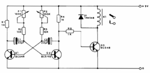 Este circuito hace que un relé abra y cierre sus contactos a intervalos regulares controlando una carga externa. El ajuste del tiempo de cierre e intervalo se realiza en los potes P1 y P2. El circuito puede ser alimentado por tensiones de 9 a 12 V, según el relé utilizado. El relé es del tipo sensible de 50 mA. Los cambios en los valores de los capacitores se pueden realizar para obtener intervalos en una banda de acuerdo con la aplicación.