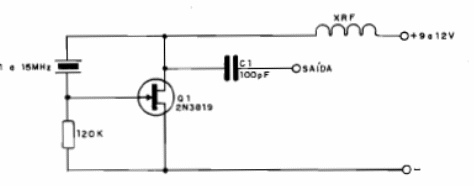 La frecuencia de este oscilador es controlada por un cristal, el cual determina su valor. El JFET puede ser sustituido por equivalente como el MPF102 o BF245. XRF es un choque de 100 uH a 470 uH y la alimentación se puede hacer con tensiones de 9 a 12 V. El capacitor C1 debe ser cerámico.