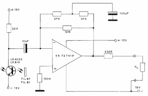 El circuito integrado en realidad es el conocido 741, ya que la versión dada es de Texas Instruments que sugiere la configuración. La fuente de alimentación debe ser simétrica y la resistencia de 10 M determina la ganancia del circuito. La red de 47k con el condensador determina el corte de frecuencia.