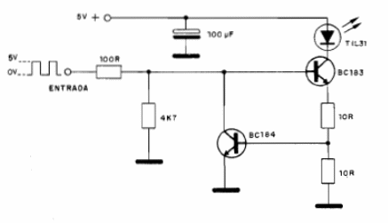 Este circuito de shield está indicado para LED de corrientes elevadas (hasta 200 mA) que operan con señales TTL en un enlace de datos de infrarrojos, por ejemplo. El transistor se puede sustituir por el equivalente 2N2222 o 2N2218. Los circuitos similares a este se pueden encontrar en esta sección y en todo el sitio. El circuito es sugerido por Texas Instruments en su Manual de Optoelectrónica.