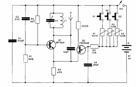Este pequeño transmisor para un alcance que puede llegar a los 100 metros tiene tres canales de tono que se ajustan en los trimpots. Si bien utiliza el transistor unijunción, poco empleado en nuestros días, se trata de un montaje simple e interesante. CV y L1 determinan la frecuencia. Para el rango de 27 MHz utilice 11 espiras de hilo 26 o 28 con un diámetro de 1 cm sin forma y para CV un trimmer común de 30 a 40 pF de capacidad máxima. La antena es telescópica y para mayor alcance cambie el BF494 por un 2N2218 y alimenta el circuito con 9 o 12 V. La antena es telescópica de 40 cm a 120 cm. Los capacitores deben ser cerámicos.