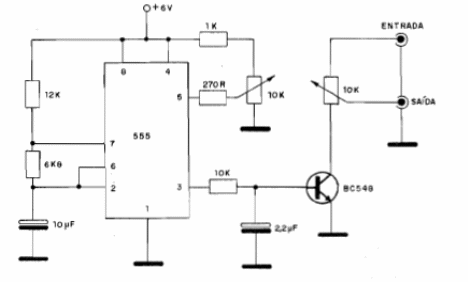 Intercalado entre un micrófono, un receptor de instrumento musical, una salida de mezclador o preamplificador y la entrada de un amplificador, este circuito produce el efecto de temblor. La frecuencia del efecto se ajusta en el potenciómetro conectado al resistor de 270 ohms y la profundidad del efecto se ajusta en el otro potenciómetro. Los cables de entrada y salida de señales deben ser blindados y la alimentación con una tensión de 6 V