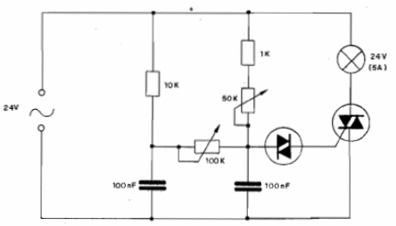 Algunas lámparas de proyectores y equipos industriales operan con una tensión de 24 V. El circuito mostrado en la figura posibilita el control de brillo de esas lámparas. El TRIAC puede ser cualquiera de la serie TIC de acuerdo con la corriente de la lámpara y el diac es común con tensión de disparo inferior a 20 V. El TRIAC debe estar dotado de radiador de calor y los condensadores son de poliéster. El potenciómetro de 100k ajusta el rango de actuación del control
