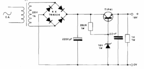 Esta fuente se puede utilizar para alimentar amplificadores de audio hasta 1 A y otros equipos que requieran una tensión de 18 V. El transistor debe montarse en un radiador de calor. Con cambios sólo en el zener esta fuente puede proporcionar tensiones en el rango de 15 a 22 V. Para otras tensiones y corrientes existen varias otras fuentes en el sitio.