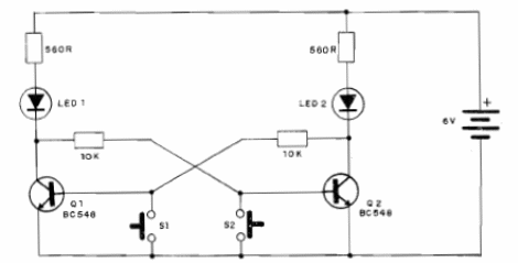 Este flip-flop o biestable controla los LED cuando se presionan las teclas S1 y S2. La alimentación se realiza con una tensión de 6 V y los LED son comunes. Vea otros circuitos como éste en el Banco de Circuito.