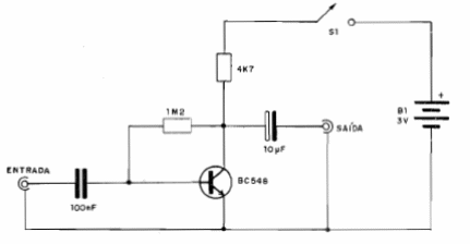 Este paso amplificador debe ser utilizado con señales muy débiles de transductores de media y alta impedancia, receptores experimentales, sensores, etc. La resistencia de 1M2 debe ser cambiada en función de la fuente de señal para obtener mayor amplificación y un mínimo de distorsión. El circuito tiene bajo consumo y puede ser alimentado por pilas AAA o AA.