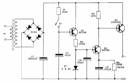 Esta fuente, al ser conectada, hace que la tensión en el circuito alimentado no sea establecida de forma brusca (soft start), sino de forma suave, evitando los chasquidos en el altavoz, que pueden ser perjudiciales para este componente. El transformador es de acuerdo con el amplificador alimentado y el transistor 2N3055 debe montarse en un buen radiador de calor. La tensión máxima del circuito alimentado es 60 V y la corriente máxima 2 A.