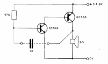 Podemos evaluar el valor de un capacitor o comparar dos capacitores, un conocido y Cx, por el sonido emitido por este oscilador simple. Los capacitores de 10 nF a 47 uF pueden ser probados. La emisión del sonido indica que el capacitor está con y el sonido emitido puede darnos una idea de su valor. El circuito puede ser alimentado por 2 a 4 pilas pequeñas.