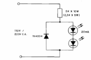 Se muestra en este circuito cómo conectar una secuencia de 2 a 10 LED en 110 V o 220 V, de forma sencilla usando un resistor reductor. La corriente es del orden de 20 mA.