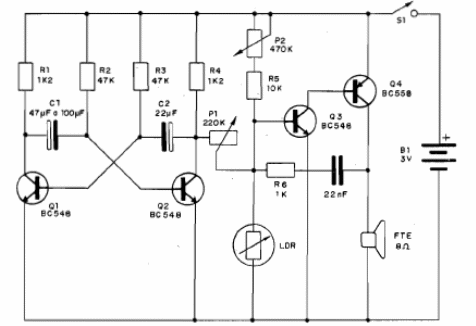 Cuando la luz deja de incidir sobre LDR este circuito comienza a producir un sonido similar al de un grillo. Colocado en un dormitorio, inmediatamente molesta a las personas que, al encender la luz, hacen que deje de cantar ... Una broma electrónica bastante interesante. El circuito es alimentado por dos pilas pequeñas y los únicos ajustes se realizan en los trimpots. El altavoz es de tipo miniatura de 2,5 o 5 cm. Otros circuitos con el mismo propósito se pueden encontrar en el sitio, sin embargo sin el LDR.