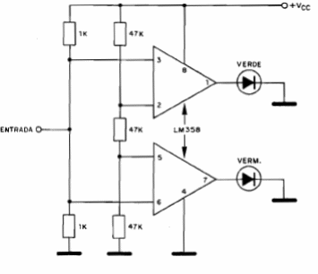 Cuando la tensión de entrada es mayor que 2/3 de la tensión de alimentación, se enciende el LED verde y cuando es menor que 1/3 de la tensión de alimentación, se enciende el LED rojo. De esta forma, se pueden analizar los niveles lógicos de un circuito CMOS. La alimentación se retira del propio circuito en análisis entre 5 y 12 V. Los LED son comunes.