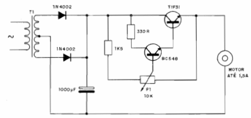 Los motores de corriente continua de hasta 1,5 A se pueden controlar con este reóstato que ya contiene la fuente de alimentación. El transformador tiene secundario con una tensión igual a la del motor y una corriente un poco mayor. El transistor TIP31 debe montarse en un disipador de calor. En el sitio tenemos varios otros circuitos de control lineal y PWM para motores de corriente continua. Vea la sección de Mecatrónica.