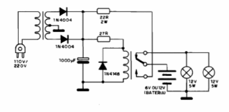 Este circuito mantiene una batería de 6 o 12 V en carga constante hasta el momento en que la energía falta. En este momento, el relé conmuta y la batería alimenta una o más lámparas con tensión de acuerdo con la batería. Se pueden utilizar baterías selladas y plomo-ácido. El transformador tiene un secundario de 12 V con 500 mA para baterías de 12 V y 6 V con 350 mA para baterías de 6 V. El resistor de 22 ohmios se debe cambiar en función de la corriente normal de carga de la batería. Observamos que este circuito no es inteligente y que las lámparas se encienden incluso cuando la falta de energía ocurra durante el día. Hay proyectos en el sitio más completos con sensores de luz.