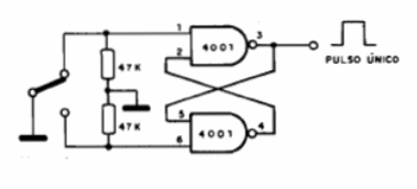 En la figura tenemos un circuito anti-repique usando una llave de 1 polo x 2 posiciones. El circuito integrado es el 4001 y la alimentación positiva se realiza en el pin 14. La negativa se realiza en el pin 7.