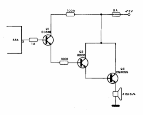 Cuando el circuito integrado 555 se utiliza en alarmas, sirenas y otros circuitos de efectos sonoros, normalmente se utiliza una etapa de potencia para la excitación de altavoces; El paso mostrado proporciona varios vatios a un altavoz de 4 ó 8 ohms, con alimentación de 12 V. El transistor de potencia debe estar dotado de radiador de calor.