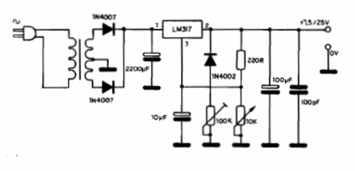 El circuito integrado debe estar dotado de un buen radiador de calor y el transformador debe tener un secundario de 25 V o 17 V con 1,5 A. Los condensadores deben tener tensiones compatibles con el circuito y el trimpot de 100 k actúa como ajuste de protección. Vea este circuito simulado en la sección de circuitos simulados del sitio. Para más corriente se puede utilizar el LM350. Vea proyectos de fuentes en artículos del sitio.