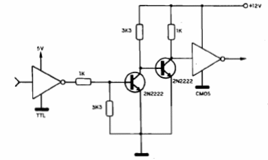 El circuito muestra la manera correcta de hacer el interfaz de un circuito TTL alimentado por 5 V con un circuito CMOS alimentado por 12 V. Los transistores son tipos de conmutación y los puertos lógicos son de cualquier tipo de las familias correspondientes. Este circuito funciona como shield.