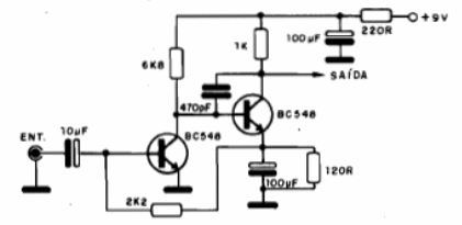 Los captadores telefónicos son bobinas que, colocadas junto a un auricular (desde que sea del tipo magnético) captan los sonidos y los transfieren a un amplificador. Como la señal capotada es débil es necesario haber una buena preamplificación, lo que se logra con el circuito abajo. Como el consumo es bajo, puede ser alimentado por una pequeña batería. En el caso de teléfonos con auriculares piezoeléctricos, se consigue algún efecto colocando el captador cerca de la línea. El primer transistor BC548 puede ser sustituido por un BC549 de mayor ganancia. La entrada de señal del captador debe realizarse con un cable blindado.