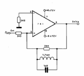 Las señales en la frecuencia de 100 kHz pasan con una ganancia de 20 dB. Se rechazan las señales de otras frecuencias. El inductor y el condensador pueden ser cambiados para que el circuito opere en otras frecuencias, recordando que la ganancia del 741 cae acentuadamente a partir de los 100 kHz. La fuente de alimentación debe ser simétrica y los amplificadores operacionales equivalentes se pueden utilizar.