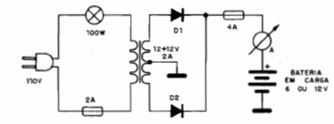 Este cargador de baterías de 6 a 12 V del tipo plomo-ácido utiliza como limitador de corriente una lámpara en serie con el primario del transformador. El transformador es de 12 + 12 V x 2 A tanto para la carga de baterías de 6 V como de 12 V, ya que la limitación y caída viene de la lámpara. Los fusibles protegen el circuito y para una carga más lenta o las baterías más pequeñas puede reducirse la potencia de la lámpara. El amperímetro (opcional) mide la intensidad de la corriente de carga.