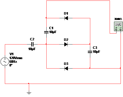 El circuito mostrado en la Figura 1 se utiliza a menudo en fuentes de alimentación. Es posible obtener una tensión continua que tiene tres veces el valor de pico de la tensión de entrada sinusoidal. Los condensadores y diodos deben ser capaces de soportar la tensión de entrada máxima. La corriente y la ondulación dependen de los valores de los condensadores usados. Con un pico de 155 V de entrada (110 Vrms) tieniemos una salida de 464 V.