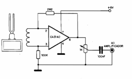 Un sensor magnético formado por 100 a 500 espiras en un tubo que envuelve uno de los brazos de un diapasón mecánico proporciona una señal que puede ser amplificador por un amplificador común. La ganancia es dada por el trimpot o pote de 1 k. La alimentación puede ser hecha por pilas ya que el consumo del aparato es muy bajo. El cable del captador magnético al circuito debe ser blindado para que no ocurra la captación de zumbidos. El resistor de 2M2 determina la ganancia, pudiendo ser alterado.
