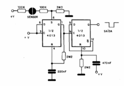 Los toques en las placas conectan y apagan la carga conectada a la salida, con una señal en la forma de onda presentada. El circuito es biestable y hace uso de los dos flip-flops existentes en el 4013. La alimentación del 4013, no indicada en la figura se hace con el positivo en el pin 14 y negativo en el pin 7. Los sensores son dos planchas de metal que deben ser tocadas al mismo tiempo. La alimentación se puede realizar con tensiones de 5 a 12 V.