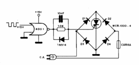 Este circuito conmuta señales de un SCR a partir de señales digitales aplicadas a un puerto 4001. La carga depende del SCR utilizado. Vea que el SCR utilizado es un MOS SCR y los diodos deben ser capaces de conducir la corriente de la carga controlada. La alimentación del CMOS puede oscilar entre 5 y 12 V.