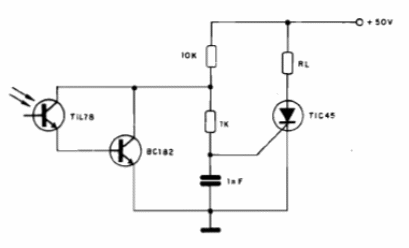 Esta configuración, sugerida por Texas Instruments en su Manual de Optoelectrónica, muestra cómo disparar un SCR desde un foto-transistor en una configuración de Darlington de alta velocidad. El circuito es alimentado por 50 V, pero se pueden utilizar otras tensiones con cambio del valor del resistor de 10 k. El SCR también admite el equivalente, pudiendo utilizarse tipos más modernos. RL es la carga alimentada y debe elegirse de acuerdo con las características del SCR. Observamos que se trata de circuito de corriente continua con el disparo y bloqueo del SCR.
